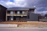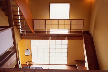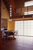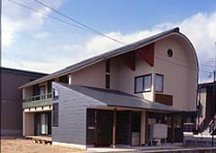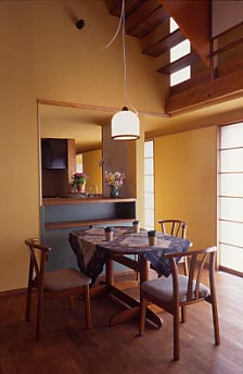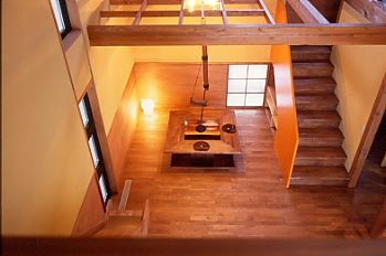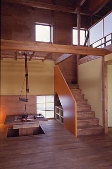 | 囲炉裏が欲しい父、すべり台が欲しい母・子、そして鳥の顔にしたい篤(設計者) の意見が集結しました。 家族の大好きなグリーンカラーでまとめられた外観。ちょっと横を見ると赤いくちばしを持った大きな鳥が私たちを迎えてくれます。 居間を中心に吹き抜けが広がり、2階からロフトへとのびやかに階段がかけられています。その反対側にはすべり台。子供たちは家の中を自由自在に動き回っていることでしょう。障子が生みだす柔らかな灯かりのもと、囲炉裏端からは皆なの話し声が聞こえてくるような気がします。(文 村松利枝子) |