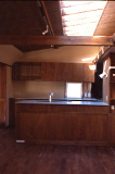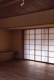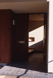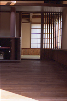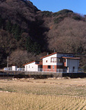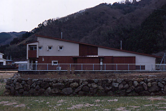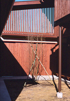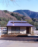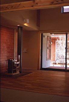 | 周りを山に囲まれた立地条件に建つ二世帯住宅。 細長い敷地を有効に使うため、中庭を挟んでそれぞれの世帯を分け、通風と採光をはかっている。 片流れの大屋根を架けることで、冬の強い季節風(西風)を遮りながら、中庭を陽だまりのゾーンとして仕上げている。 南側の河川敷には桜並木が連なり、当然これを意識して窓の位置を決めている。(文 村松利枝子) |