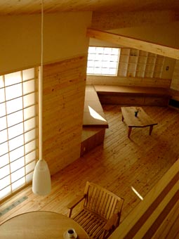 設計するにあたっては、伊達という街にこだわった。藍染めの街ということで屋根には藍色の金属板をはり、外壁を藍色仕立てにした。室内の一部にも藍染めの和紙を貼り、テーブルクロス等の敷物には藍染めのものを用いた。また、“伝統文化である刀造りを住宅に取り入れる事ができないだろうか?”と考え、丸窓の飾り格子に地元の刀匠によって打たれた刀を取り付けた。高く配置された窓から差し込まれた陽射しが室内を明るく照らし出す。広々とした空間には活力がみなぎっている。