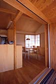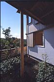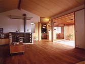 | 階段を上がり、まず目に飛び込んでくるのは、生い茂る木々の緑。2階リビングからは、茶畑から日本平までに広がる風景を見渡すことができます。この家の実際の庭は、敷地の面積や変形した土地、そして少し振れている方位等の関係で、充分に設けるには無理があったのですが、まさにこの家のためにあるのではないかと思える、この借景によって何倍にも広がっています。南側に掛けられているバルコニーは、日本平の花火大会の時、特等席となったようで羨ましいかぎりです。 木の持つ温もりが肌にやさしく、広々とした空間のとても気持ちのよい家です。湿気が気になった社宅住まいの時には、アトピーで悩んでいたご家族も、この家に引っ越してからは、そんな悩みが嘘のように消え快適に生活することができるようになったと喜んでいました。(文 村松利枝子) |