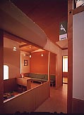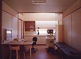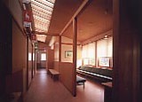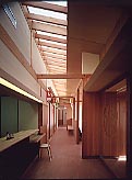 無機質な病院のイメージを離れ、木肌の持つ温もりを大切にした病院です。玄関を一歩入ると、外側の喧騒をまったく感じさせない空間が広がっています。中央通路上部の天窓からは木漏れ日が射し込み、待合室の窓から眺められる緑の木々は私達の心を癒してくれることでしょう。(文 村松利枝子)