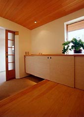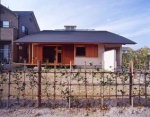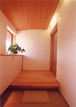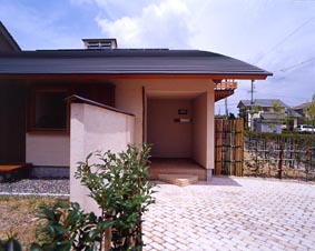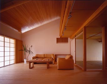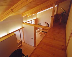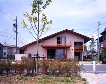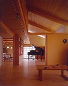 | この奏庵の1階は、リビングを中心にダイニング、キッチン、そして和室があります。中2階レベルにトイレ、洗面、風呂の水回りを配し、2階は寝室と学びの間というとってもコンパクトな家。だけどリビングは吹き抜けとデッキへの繋がりによって、とても広々と開放感に満ちています。このリビング(正確にはリビングの延長の部屋)にはピアノが置かれ、音楽を奏でながら生活していけたら素敵だなあという想いが実現しました。ちょっとしたお茶会(内輪の発表会)を催すことができます。また、リビングに隣接した和室からは坪庭が眺められます。日常の疲れを癒してくれることでしょう。 特徴としては、基本的に1階はワンルームになっていますが、微妙に視線をそらせながら間仕切りを施すことで、空間が引き締まり、流れ(リズム)を生まれました。施工において構造材に松材を使ったことで、空間は明るく華やかになりました。屋根と壁の間のスリットからは、自然の光が差し込んでいます。そして床暖房による自然な暖かさも実現しました。 そんな空間を包むように、大屋根が架けられています。この屋根は京都でよく見かけられるむくり屋根(屋根が少し丸みをおびている)。この辺りでは珍しいのではないでしょうか。(文 村松利枝子) |