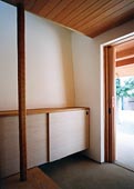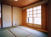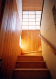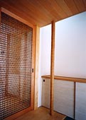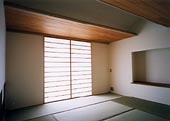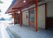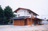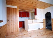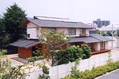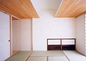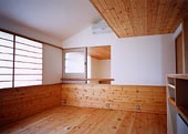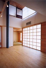 | 今まで仕事に費していた時間を、これからは自分達の趣味に費したい、そして静かに楽しく暮らしていきたいというご家族の想いを受けて設計された住宅です。なんと親世帯の施主は80歳です。ご夫婦の老後と同居しているおばあさんのことを考え、車椅子でも快適に生活出来る環境(段差をなくす、広い廊下、広めのトイレ、浴室等)の工夫がされています。そして健康のことを考え、ソーラーシステムを導入しました。リビングの片隅にあるダクトは、どうしても無機質になってしまいがち。以前、織屋を営んでいた時に織った布をスパイラルに巻きました。 1階リビングは吹き抜けになっているので広々と2階へと続いていきますが、子世帯とのプライバシーを考慮しての設計になっています。当初は週末に家族が集まる週末2世帯住宅ということだったのですが、設計を進めているうちに子世帯の家族もやはりこの家に住みたいということを強く希望され同居ということになりました。2階はリビングと和室の二間ですが、リビングから繋がるロフトを利用することで広いスペースを確保することが出来ました。そのロフトのドアには、子世帯の施主のお母さんが普段着ていた着物を加工して貼ってあります。また、ご家族の希望で以前住んでいた住宅に使われていた建具を2階の吹き抜け部分や和室に使用しています。(文 村松利枝子) |