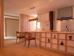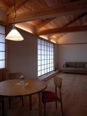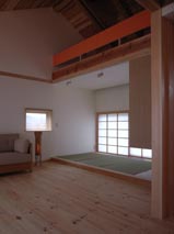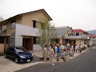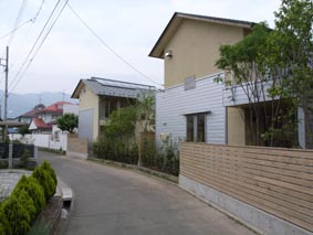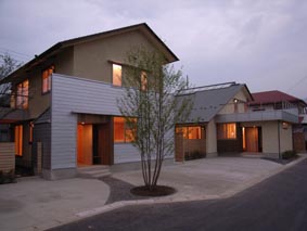 | <設計概要> 江戸時代、城下町や宿場町として栄えていた上田市。北国街道沿いには、当時の職人達が魂を込めながら丁寧につくりあげた美しい町並みが、見事に残されている。一見地味に見える町並みだが、うだつや連子格子に見られるように、日常生活における知恵がそのままデザインに反映されていて、とても興味深い。また、それらは一方で盆地特有の気候(1年を通して寒暖や気温の差が激しく、あまり強風は吹かない)が、その土地ならではのデザインを成熟させている要因なのかなとも思う。私はそういった先人達のアイデアの中から、現代において必要とされるものを新しい表現でかつ、永くその町に生き続けるような民家をつくりたいと強く感じた。 <設計条件> 市の中心部から川を渡り、南西方向に車を10分走らせたところにその敷地はある。周辺は閑静な住宅地で、西と東に道路が走るもののそれを利用するのは住民達だけのようなので、交通量は少ないように思われた。2階レベルからは遠くの山並みを家々の合間から望むことができ、また適度な通風も期待できそうである。ただひとつ気になる点は、南側隣家の敷地境界線に接近して建てられているため、B棟(南側の住宅)への日照の確保をどう図るかということであった。 A棟 一般的な広さの敷地の場合、すこしゆったりしたプランニング(次の間があったり、2階ホールが広々していたり)で、大きな吹き抜けが可能になる大屋根プラン B棟 敷地が狭い場合には、コンパクトなプランニング(廊下のない合理的な空間構成、家具配置をあらかじめ考慮)で、日照を確保するため2階リビングが可能になる総2階プラン(文 村松篤) |