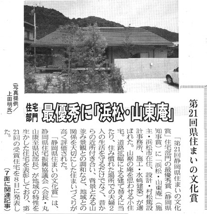 | 第21回静岡県住まいの文化賞で、『浜松・山東庵』が最優秀賞(静岡県知事賞)を受賞しました。 この賞は静岡県住宅振興協議会が住生活・住文化の育成と住宅産業の振興を目的に、県民の住生活の育成に貢献した建築士や建築業者など個人・団体や地域の特性などを生かして建築された住宅に対して贈られるものです。この住まいの文化賞には65点の応募があり、最優秀賞1点、優秀賞7点が選ばれました。 9月19日(土)、午前11時30分から、「静岡県住まい博2009」が開かれている静岡県駿河区のツインメッセ静岡・南館で表彰式が行なわれます。また表彰式の後、午後2時30分からは、建築主(Oさん)、設計者(村松篤)、施工者(水ア棟梁)がそれぞれの立場から意見を述べるトークショーが催されます |
