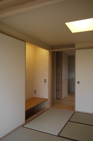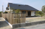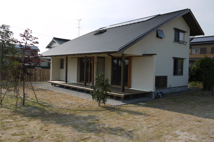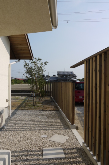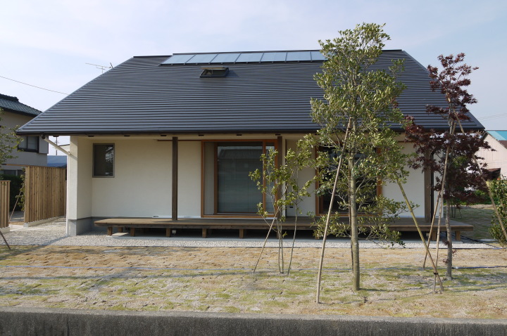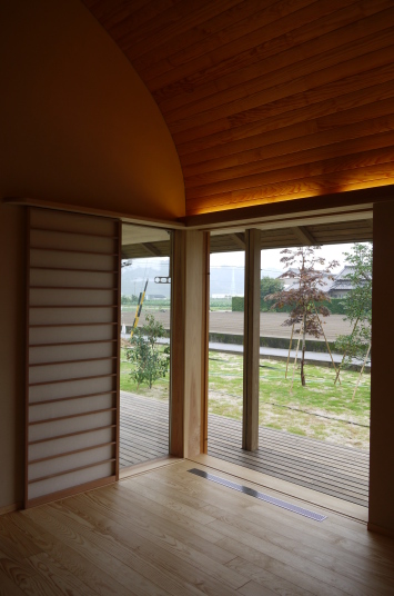 普段何気なく生活している周りの風景。これがある日突然、一変してしまう現実を目の当たりにしたことはありませんか。慣れ親しんだ森の木々が薙ぎ倒され、禿山の様相を見せたと思いきや、工事車輌の強力で土が崩され、いつの間にか道路が出来、インフラが整備され、住宅地へと変貌を遂げる。新しい町がまたひとつできたその場所には、何処の国のデザインかまるで分からない無国籍住宅なるものがアメーバのように繁殖していく。そこには、家づくりにあたって一定の協定なるものが存在してはいるものの、わが国特有の自分第一主義を盾にして、秩序の無い集落が出来上がっていくのだ。これまで数多くの新興住宅地が、同じ足跡を辿って来たことは今さら言うまでもない。 一方で、さほど大きくは変わらない風景も存在する。そこは周辺の土地が田畑によって占められてはいるものの、計画道路が走り、河川も整備されているような場所である。現状では、ここに都市を築いていくことを行政側が禁止しているので、早々に変化していくはまずありえない。ただ、郊外に見られるような大型ショッピングセンターが合法を主張し、出店などという可能性は否定できないが・・・。 周りは住宅で囲まれているものの、東側は長閑な田園風景がどこまでも続く環境にその土地はある。西方には一級河川の天竜川が流れ、地元では暴れ天竜≠フ名の通り過去に幾度も氾濫した経験を受けてか、立派な堤防が築かれている。とはいえ、静岡県がWebで公表している浸水マップによると、辺り一面は相当の高さまで浸かってしまうことが分かっているので、決して油断はならない。先日起きた大震災でも見られたように、想定外の事態はいつ起きても不思議ではないのだ。非常時における備えを万全にした上で、日常の平穏な生活を送る大切な住まいとはどうあるべきかを、長い時間を掛けて考えてみた。 はじめにそこを訪れたとき、町に住む人が、そこを通りがかった人が、あるいはここを訪ねてきた人が、一瞬立ち止まるような家をこの場に置こうと思った。それはどこか実直で素直な印象を持ち、容姿が美しく、洗練かつ素朴な雰囲気を醸し出した家だ。決して主張しているわけではないが、必ず目に留まるであろう優しい表情の大屋根は、素形というか日本人が持っている感性に響くものを感じさせてくれる。塗り壁による外壁、全開になる木製の建具、深い軒下の木製デッキ、昔の農家を思わせる土間の叩き等々、どれも昭和人にとっては見慣れたものだが、これらを新しいデザインでかつ機能を向上させることによって、全く違うものに進化させたいと考えた。 林立した杉の柱にコンクリートの壁が貫入するアプローチは、この先にどのような世界が展開しているのかを想像させるような設えとした。それは拒絶せず、誰でも迎え入れたいという住まい手の想いが、ひとつの形を導き出している。木とコンクリートのどちらも無垢の材料は、住まい手の本物を追求する正直な心にどこか通じるものがあるのかもしれない。時間の経過とともに熟成した表情になりえた時、この町にとっていつまでも語り継がれるような素直な家になることを、心から願っている。(文 村松篤) |