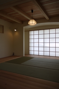 | かつての日本家屋には、無垢の柱や梁、節有りの床、い草の畳、鏝跡が残る土壁、手漉き和紙が貼られた障子や襖、裸電球の明かりが用いられた。その空間で家族の絆が結ばれ、茶の間と呼ばれる文化が地域に根付いていった。 夏の家は風が通り抜けるため快適だが、冬は断熱が乏しい上隙間風が入り込むためとても寒い。はじめは家族で炉を囲み寒さを凌いでいたが、その後炬燵が登場してからは綿入りの上着を羽織り、お茶をすすりながらTVを観たりして団欒の時間を過ごすようになっていった。床に座る暮らしだからこそ、必然的に目線が下がり、重心が低くなっていったのではなかろうか。家の中では靴を履かない日本人だからこそ味わうことが出来るこの快感は、おそらくその空間に包まれる安心感からくるものなのだろう。 古き良き日本文化の精神を汲み取りながら、現代の技術や機能を併せ持つ建築を創造してみた。癒し、安らぎ、休息、和み、楽しみを実現するためにはどうあるべきかを考え、あらゆる角度からプランを練り上げていった。低い軒、アルコーヴ、光と風、無駄の無い空間利用等が具体的な要素だが、これらが融合した建築をひとつひとつ探り当てていくように体感して欲しい。そして、どこかに懐かしさを感じる喜びを味わって欲しい。木漏れ日が射し込む茶の間に心地良い風が通り抜け、庭の木々にとまっている野鳥の囀りを聞きながら、静かに時が流れていく贅沢な空間。思わず口元が緩んでしまう、そんな住まい手の姿を想像しながら・・・。(文:村松篤) |