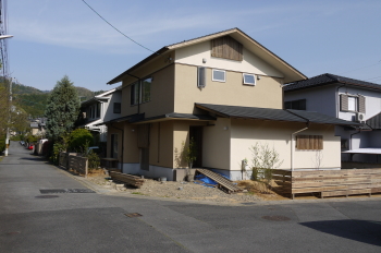 | 敷地は、郊外の閑静な住宅地の中にある。北西道路の角地であることから道路側の見通しは良いものの、南東側は隣家が迫っていて窮屈な感じは否めない。北道路は傾斜がなく進入には問題がないが、西道路は傾斜が大きく高低差の処理が難しいように感じられた。それでも、東と北の民家の庭の木々や遠くに望む比叡山がこの土地のご馳走で、これらを頼りに計画を進めてみることとした。