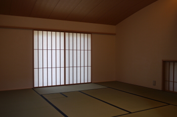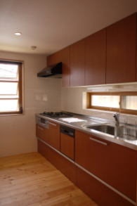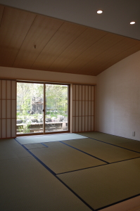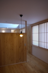 配置は北と東に基準のセットバックいっぱいまで寄せ、南側の距離を確保しつつ、西側にもゆとりを持たせるようにした。駐車スペースは北側に台、アプローチは道路との高低差が少ない北西角とし、自転車の持ち込みが出来るようにスロープとしている。室内は、明暗と広狭が融合したメリハリのある空間に仕上がった。居間の吹抜けの窓からは自然光が降り注ぎ開放的な設えであるのに対し、北側の8畳は高さを押さえた天井と窓が陰翳を醸し出し北庭へと視線が運ばれるデザインとした。それぞれの場が目的をもって共存するような、そんなプランが完成した。 精神を落ち着かせる侘びた世界観と、己の音を楽しむ価値観が詰まった住まい。これからどのようにしてこの土地に根付き、染まっていくのだろうか。 10年後、20年後の佇まいが楽しみである。(文:村松篤) |