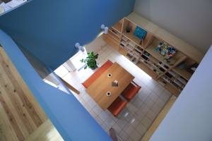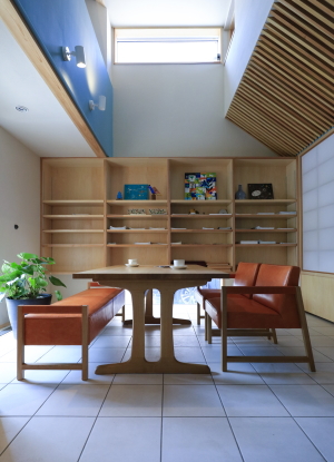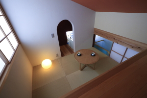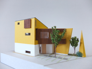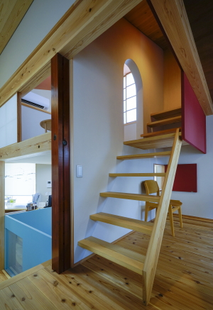 | 場所は、駅から徒歩で約10分。近くには親子連れが集まる科学館や、カルチャースクールで人気の施設がある。前面道路は通り抜けを利用する車の往来が激しく、歩道を歩いている人も見掛けられる。カルチャーセンターを利用する駐車場が道路を隔てた正面にあり、そこからはこの場所がよく見える。このあたりは女性(主婦)と子どもたちが集まってくるエリアで、気軽にぶらりと立ち寄ってもらえそうな建築が相応しいのではないか。事務所という機能だけではなく、娯楽や鑑賞を兼ね備えたお休み処を設けたられたらと考えた。 道路境界線上に高さ5mの広告塔があり、駐車スペースの間をすり抜けるようなアプローチの先にエントランスがある。ドアを開けると、複雑な空間の連続だ。手前には吹抜空間、通路の先には階段があり左手にはまた別の空間、奥には坪庭が見える。階段を折り返すとオーヴァーハングした空間があり、吹抜けの横を上がるともうひとつの空間が現れる。その脇の階段を上がる途中と上がった先に、それぞれ別の空間が用意され、まるで忍者屋敷のような構成だ。階段もひとつの空間として利用できるようにと考えた。 こうして、街中の狭小地に静かに主張する建築が出来上った。個性的なイエローカラーの金属板に白漆喰壁を組み合わせた外壁。ダークブラウンの木格子がアクセントとして入り込む。木造建築を手掛けていることをイメージさせる配色と植栽。環境に配慮していることを裏付けるそよ風を導入したギャラリー(G)&オフィス(O)は、ひとつの建築の中に 7つの空間が入り組む。匠の技を見せる建築は、まちなかのオアシスとなりうるであろう。(文:村松) |