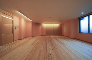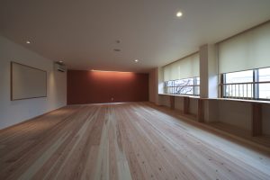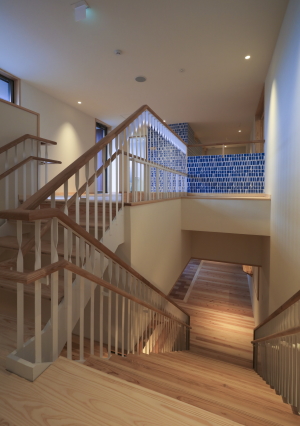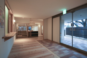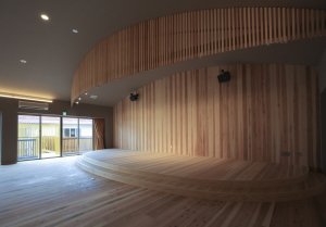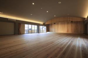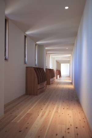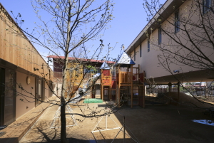 | 基礎工事を見学した際の重厚な鉄骨造りのイメージは、 内外装に県産材を使った仕上げにより払しょくされ、木の香漂う新園舎になっていた。 園庭を囲むように設けられた個々の園児室は、変形土地を効率よく利用しこじんまりとしていたが、至る所に置かれた玩具で遊んでいた園児にとってはちょうど良い広さ、保育士にとっては園児一人一人に目の届く広さのように感じた。 玄関より右手奥の階段を上がると、舞台を携えた広々としたホールがあり、園児用の布団が並べられていた。みんなで一緒に昼寝をするんだね。風が抜けていく。気持ち良いだろう。(文:村松利枝子) |